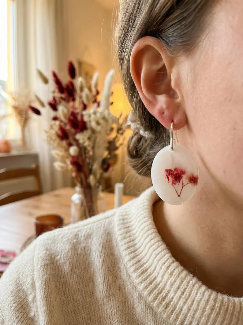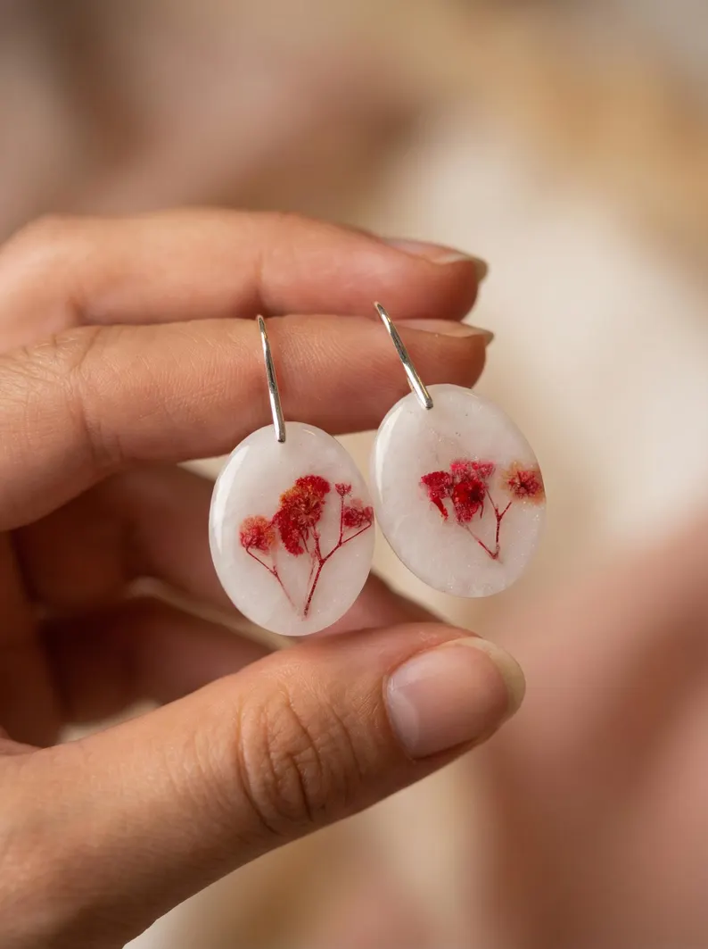 Entdecken Sie die zeitlose Schönheit der Natur mit diesen exquisiten botanischen Harz-Ohrringen. Jedes Paar ist ein einzigartiges tragbares Kunstwerk, das echte gepresste Blumen zart in kristallklares Harz eingebettet präsentiert und einen faszinierenden, ätherischen Glanz erzeugt. Das glatte, leichte ovale Design hängt sanft an eleganten Ohrhaken aus 925 Sterling Silber, was sowohl Tragekomfort als auch dauerhafte Qualität gewährleistet. Diese handgefertigten Ohrringe werden sorgfältig gefertigt und spiegeln die Kunstfertigkeit und Sorgfalt wider, die in die Bewahrung eines natürlichen Wunders gesteckt wurde. Perfekt, um Ihrem Alltagsoutfit einen Hauch von natürlichem Charme zu verleihen, dienen sie auch als raffinierter und einzigartiger Akzent für besondere Anlässe. Ihr vielseitiger Stil macht sie zu einem idealen Accessoire für verschiedene Outfits, von lässig bis elegant. Diese Ohrringe sind ein unvergessliches und aufmerksames Geschenk für Naturliebhaberinnen, eine geliebte Person oder jeden, der einzigartigen handgefertigten Schmuck schätzt. Feiern Sie die kleinen Wunder der Welt und tragen Sie ein Stück ruhiger, handgefertigter Schönheit mit sich, wohin Sie auch gehen, und verbinden Sie sich mit der zarten Kunstfertigkeit der Natur.