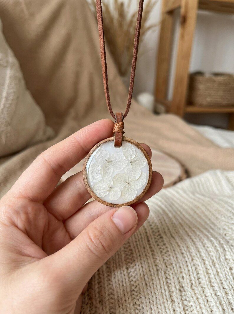 Tauchen Sie ein in die ruhige Schönheit der Natur mit dieser exquisiten botanischen Harz-Anhänger-Kette, ein wahres Zeugnis kunstvoller Handarbeit. Jedes einzigartige Stück präsentiert sorgfältig ausgewählte, gepresste Blüten, die zart in einer kristallklaren Harzkuppel konserviert sind und ein faszinierendes Fenster zur natürlichen Welt bilden. Das zentrale Motiv ist wunderschön in eine fein gearbeitete Holzfassung eingebettet, die einen organischen, erdigen Touch und einen rustikalen Charme verleiht. Dieser bezaubernde Anhänger hängt an einer weichen, strapazierfähigen Kordel, die sowohl Komfort als auch Stil bietet und ihn ideal für den Alltag oder besondere Anlässe macht. Die verstellbare Länge sorgt für eine perfekte Passform. Perfekt für alle, die schlichte Eleganz und natürliche Ästhetik schätzen, ist diese Halskette ein wirklich durchdachtes und einzigartiges Geschenk. Überraschen Sie einen geliebten Menschen zum Geburtstag, Jahrestag oder zeigen Sie einfach Ihre Wertschätzung mit diesem besonderen, von der Natur inspirierten Präsent. Sie verleiht jedem Outfit mühelos einen Hauch von Bohème-Anmut und zeitlosem Charme, von lässiger Tageskleidung bis hin zu eleganteren Ensembles. Feiern Sie die ewige Anziehungskraft der Flora und tragen Sie ein geschätztes Stück Garten bei sich, wohin Sie auch gehen, eine perfekte Mischung aus natürlicher Schönheit und handwerklicher Kunstfertigkeit.