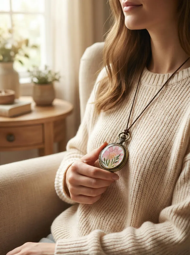 Umarmen Sie die Schönheit der Natur mit dieser exquisiten Halskette mit gepressten Blumen. Jedes einzigartige Stück enthält echte getrocknete Pflanzen, sorgfältig konserviert in einem klaren Harz-Medaillon, das einen zeitlosen Miniaturgarten schafft, den Sie nah am Herzen tragen können. Der runde Anhänger, eingefasst in eine Fassung im Antik-Bronze-Ton, hängt elegant an einem robusten geflochtenen Band, das für Ihre perfekte Passform verstellbar ist. Dieses fesselnde Schmuckstück ist mehr als nur eine Halskette; es ist ein tragbares Kunstwerk, ideal für alle, die die zarten Wunder der natürlichen Welt schätzen. Perfekt für die alltägliche Eleganz oder als nachdenkliches Geschenk zum Geburtstag, Jahrestag oder zu jedem besonderen Anlass, verbindet es die Trägerin mit dem friedlichen Geist der Natur. Liebevoll und detailreich handgefertigt, verleiht diese naturinspirierte Halskette jedem Outfit einen Hauch von rustikalem Charme und einzigartigem Charakter.