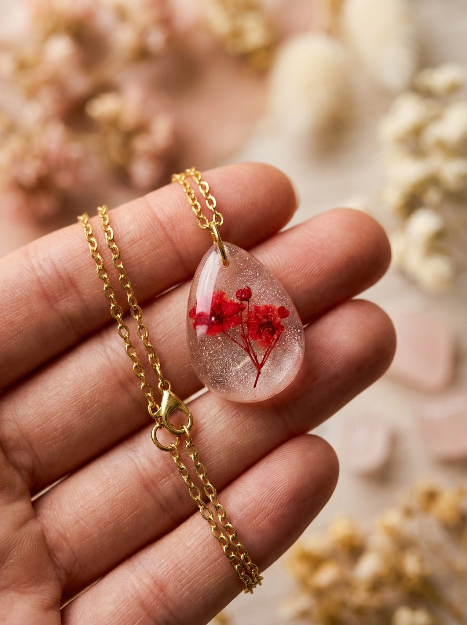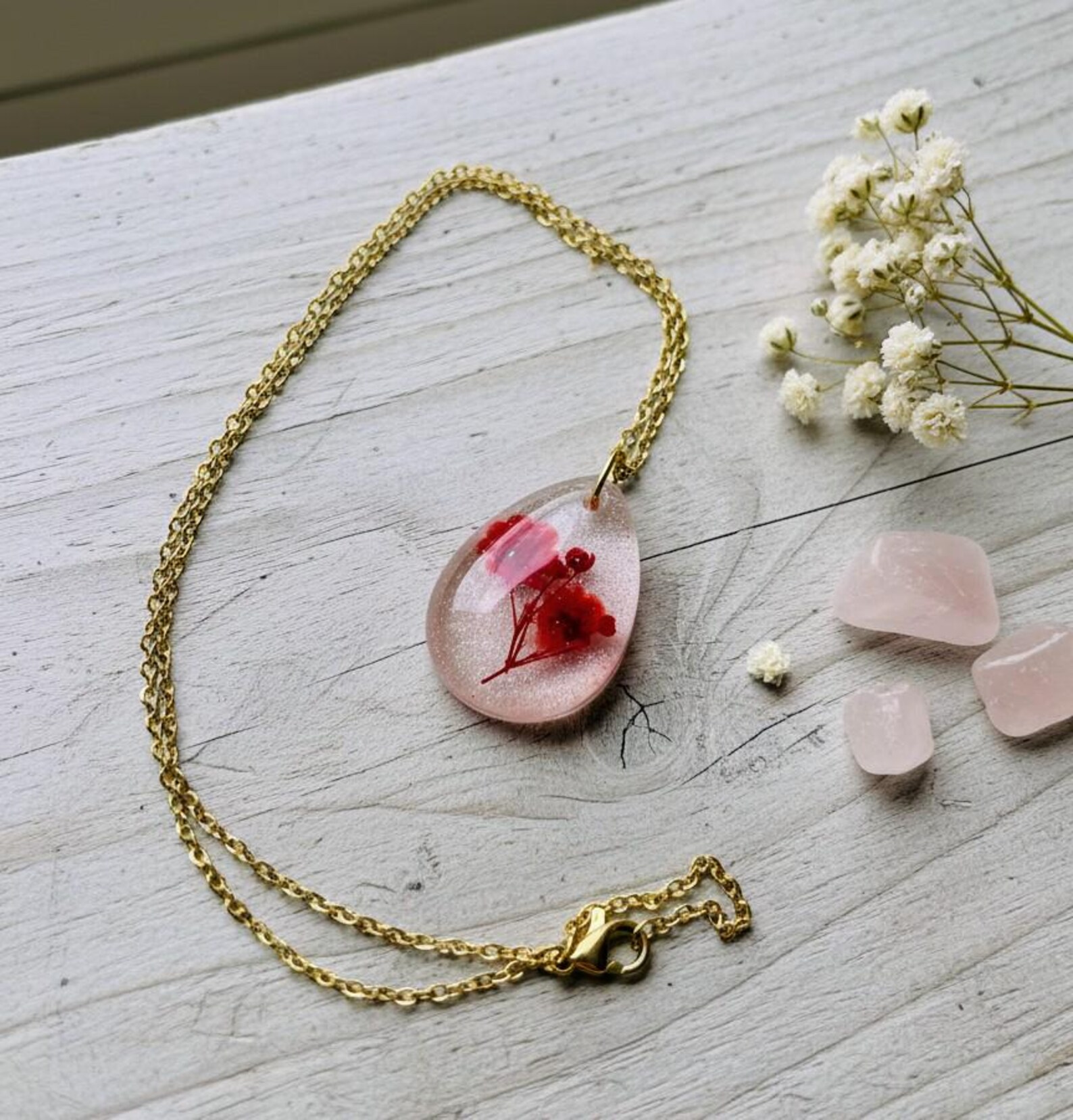 Handgefertigt aus kristallklarem Resin, enthält sie zarte, konservierte rote Blüten sowie einen Hauch sanften rosafarbenen Schimmers, der dem Schmuckstück eine träumerische und romantische Ausstrahlung verleiht.