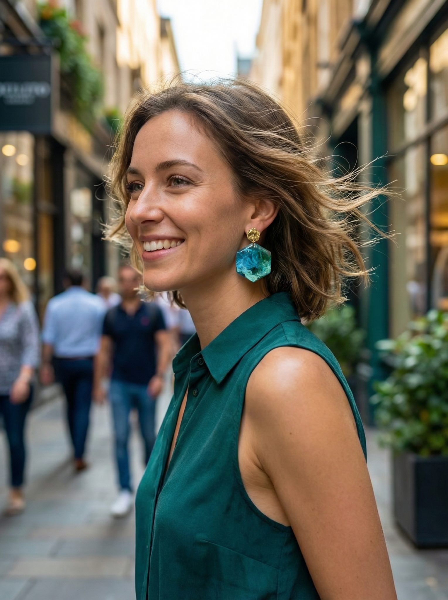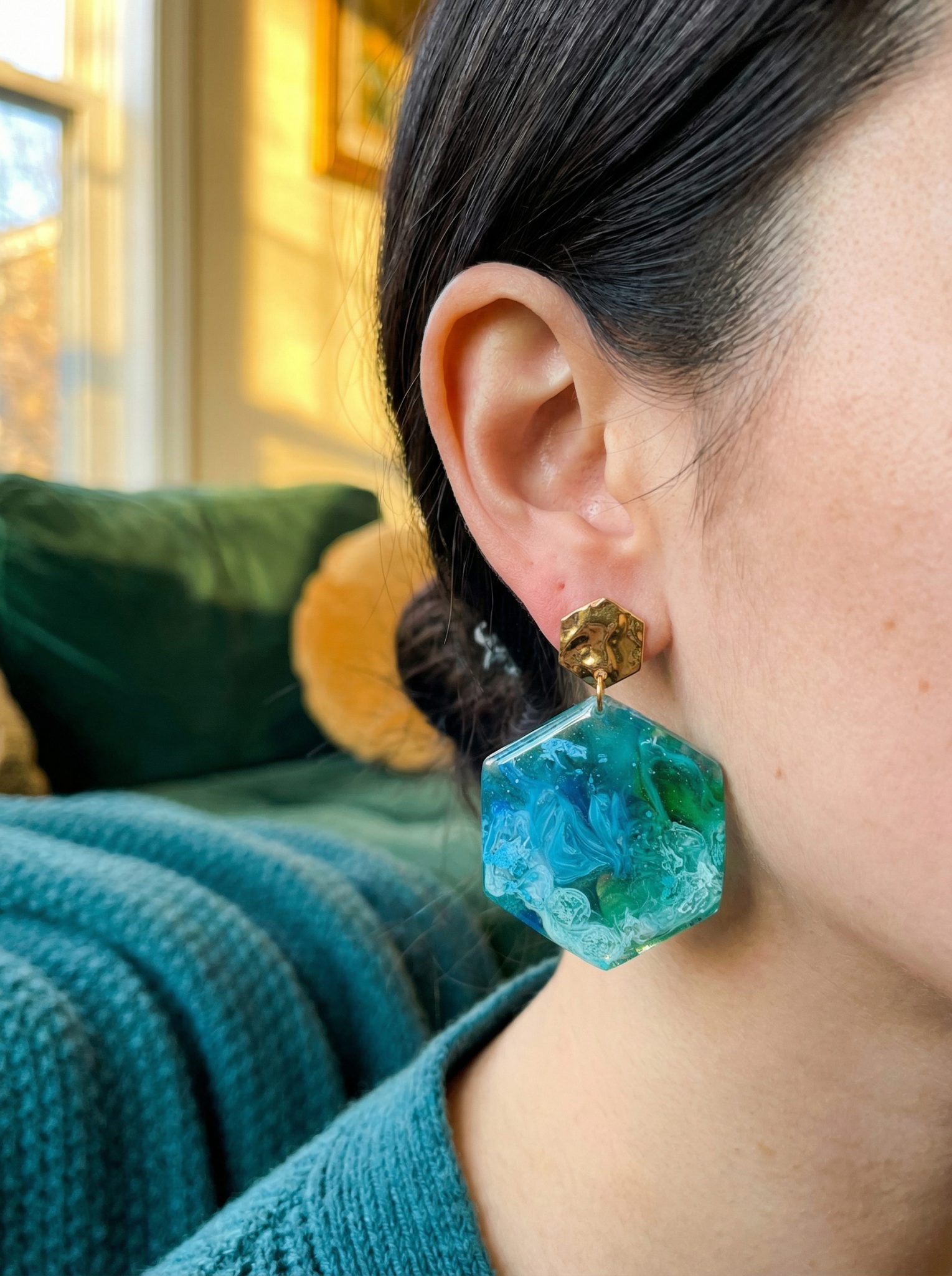 Bereichern Sie Ihre Schmuckkollektion mit diesen exquisiten handgefertigten Sechskant-Harz-Ohrringen. Jedes Paar ist ein kleines Kunstwerk, das fesselnde fließende Muster aufweist, die ein Gefühl von Tiefe und Bewegung erzeugen, sodass kein Stück dem anderen gleicht. Diese kunstvollen Ohrhänger werden sorgfältig aus hochwertigem, leichtem Harz gefertigt, was sie den ganzen Tag über angenehm tragbar macht und dennoch ein raffiniertes Statement setzt. Ergänzt werden die einzigartigen Harz-Sechskante durch elegante gehämmerte goldfarbene Ohrstecker, die einen Hauch von rustikalem Charme und raffinierter Textur verleihen. Ob Sie sich für einen besonderen Anlass kleiden, Ihrem Berufsoutfit eine unverwechselbare Note verleihen oder ein Alltagsaccessoire suchen, das wirklich auffällt, diese Ohrringe sind die perfekte Wahl. Sie sind auch ein wahrhaft einzigartiges und durchdachtes Geschenk für einen geliebten Menschen, der handgefertigten Schmuck und unverwechselbaren Stil schätzt. Erleben Sie die Schönheit tragbarer Kunst mit diesen einzigartigen Harz-Schätzen.