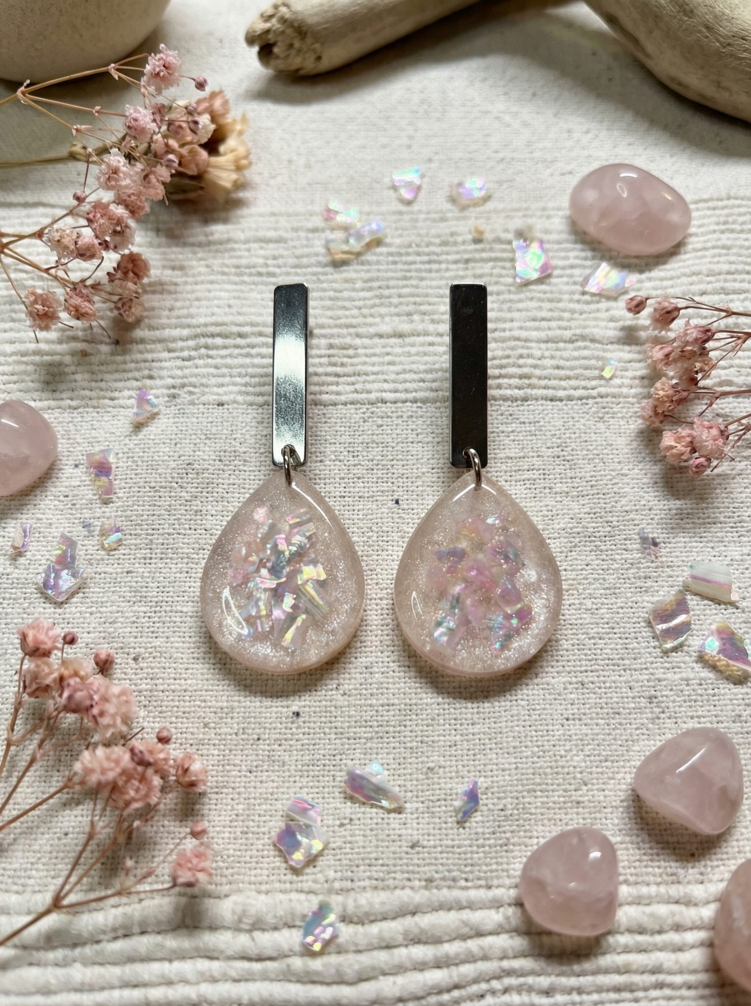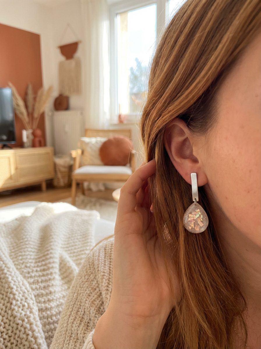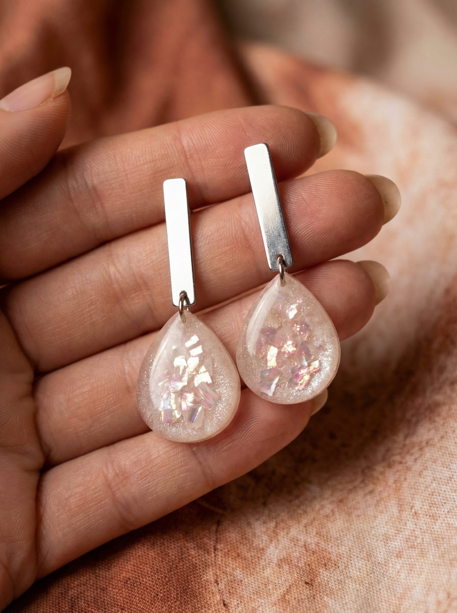 Entdecken Sie die ätherische Schönheit unserer handgefertigten Harz-Ohrhänger, ein Ausdruck von handwerklichem Charme. Jedes zarte tropfenförmige Stück wird sorgfältig gefertigt, um Licht mit einem fesselnden, schillernden Schimmer einzufangen und zu reflektieren, wodurch ein bezauberndes Leuchten entsteht, das mit jeder Ihrer Bewegungen tanzt. Fachmännisch gefertigt aus leichtem, hochwertigem Harz und mit funkelnden Einschlüssen versehen, bieten diese Ohrringe sowohl auffallende Eleganz als auch höchsten Komfort für den ganzen Tag. Das schlanke, moderne Metallstab-Design verleiht einen Hauch zeitgenössischer Raffinesse und macht sie zu einem vielseitigen Accessoire, perfekt für jeden Anlass – von lässigen Ausflügen bis zu formellen Veranstaltungen. Ob Sie Ihr tägliches Outfit aufwerten oder ein einzigartiges Statement-Stück suchen, diese Artisan-Ohrringe sind darauf ausgelegt, Bewunderung zu erregen. Sie sind ein wirklich durchdachtes und außergewöhnliches Geschenk für Geburtstage, Jubiläen oder einfach, um einem geliebten Menschen eine Freude zu machen. Umarmen Sie einzigartigen Stil und Glanz mit einem Schmuckstück, das wirklich hervorsticht.