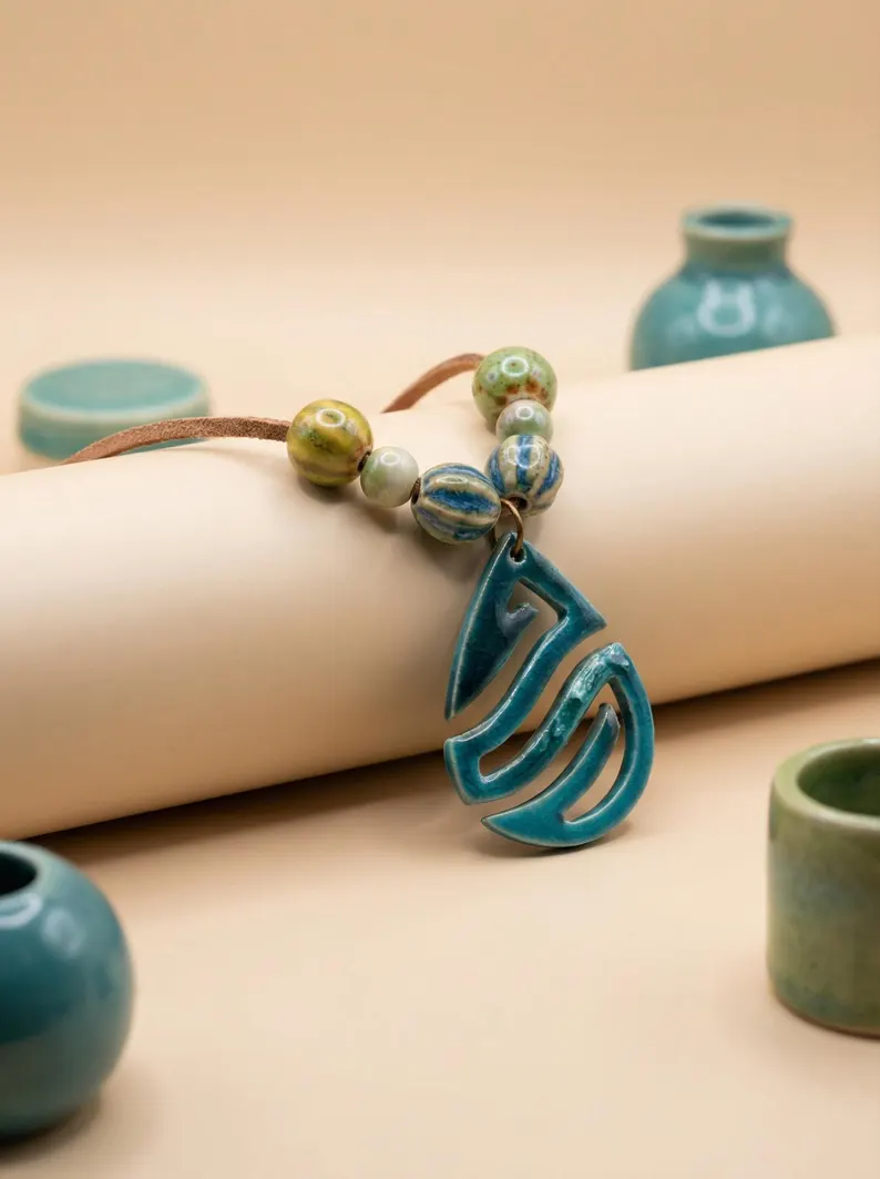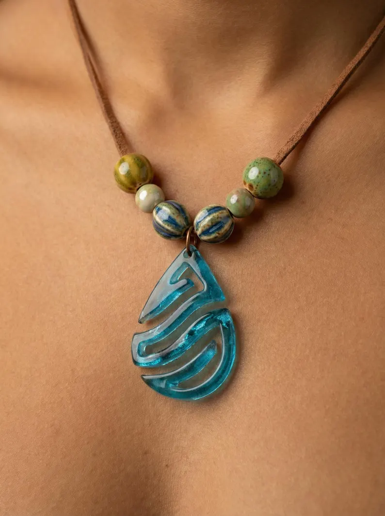 Entdecken Sie einzigartige Kunstfertigkeit mit unserer faszinierenden handgemachten Halskette, einem wahren Statement-Stück, das Ihren Stil unterstreicht. Dieses unverwechselbare Accessoire zeigt einen wunderschön gearbeiteten Harz-Anhänger, der komplizierte Muster und eine fesselnde durchscheinende Qualität aufweist, die das Licht bei jeder Bewegung einfängt. Daneben sind eine Sammlung handgefertigter, glasierter Perlen angebracht, jede mit ihrer eigenen organischen Textur und subtilem Charme. Die Perlen mit ihren unterschiedlichen Mustern ergänzen den kunstvollen Anhänger und schaffen ein harmonisches und auffälliges Design. Befestigt an einer strapazierfähigen, bequemen Kordel, ist diese Halskette perfekt, um Ihrer Alltagskleidung einen Hauch von Boho-Eleganz zu verleihen oder einen unvergesslichen Eindruck bei besonderen Anlässen zu hinterlassen. Ihre vielseitige Ästhetik sorgt dafür, dass sie mühelos zu verschiedenen Outfits passt, von lässigen Oberteilen bis hin zu eleganten Kleidern. Ein durchdachtes und einzigartiges Geschenk für einen geliebten Menschen oder eine besondere Freude für sich selbst, diese handgefertigte Halskette zelebriert den individuellen Stil und die Schönheit handwerklicher Kunst. Entdecken Sie die Freude, wirklich originellen Schmuck zu tragen, der eine Geschichte erzählt.