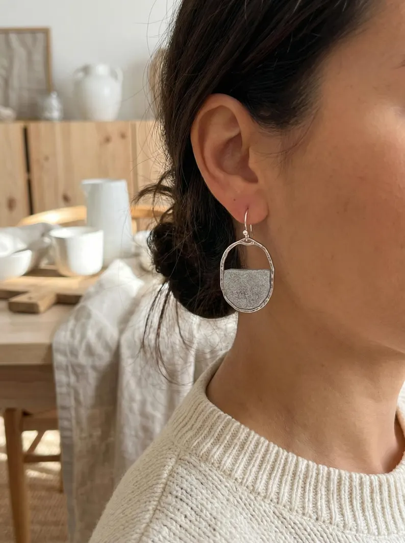 Entdecken Sie den bezaubernden Reiz unserer sorgfältig handgefertigten Ohrhänger, ein wahres Zeugnis kunsthandwerklicher Meisterschaft. Jedes Paar verfügt über eine faszinierende, lichtfangende Einlage, die einen einzigartigen Glanz bietet und wunderschön durch die organische Textur der Metallarbeiten kontrastiert wird. Diese eleganten Tropfen-Ohrringe sind dazu bestimmt, jedem Ensemble einen Hauch von anspruchsvollem Funkeln und Bohème-Chic zu verleihen. Egal, ob Sie sich für einen besonderen Anlass kleiden oder Ihren Alltagslook aufwerten, ihr unverwechselbares Design sorgt dafür, dass Sie auffallen. Mit viel Liebe zum Detail und Leidenschaft für einzigartige Accessoires gefertigt, sind diese Ohrringe nicht nur Schmuck; sie sind ein Ausdruck von Individualität und seelenvollem Ausdruck. Sie sind ein perfektes, durchdachtes Geschenk für einen geliebten Menschen, um seinen einzigartigen Geist und Stil zu feiern. Genießen Sie den subtilen Luxus und den handgemachten Charme, der diese Ohrringe wirklich besonders macht.