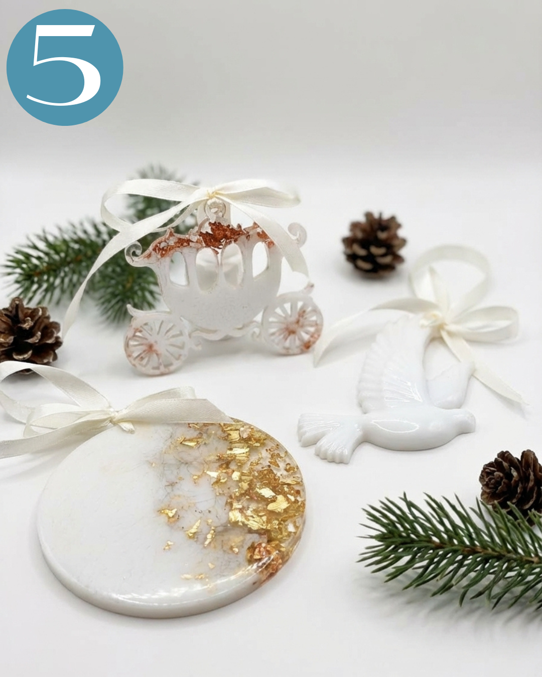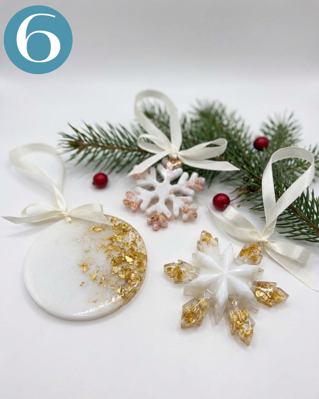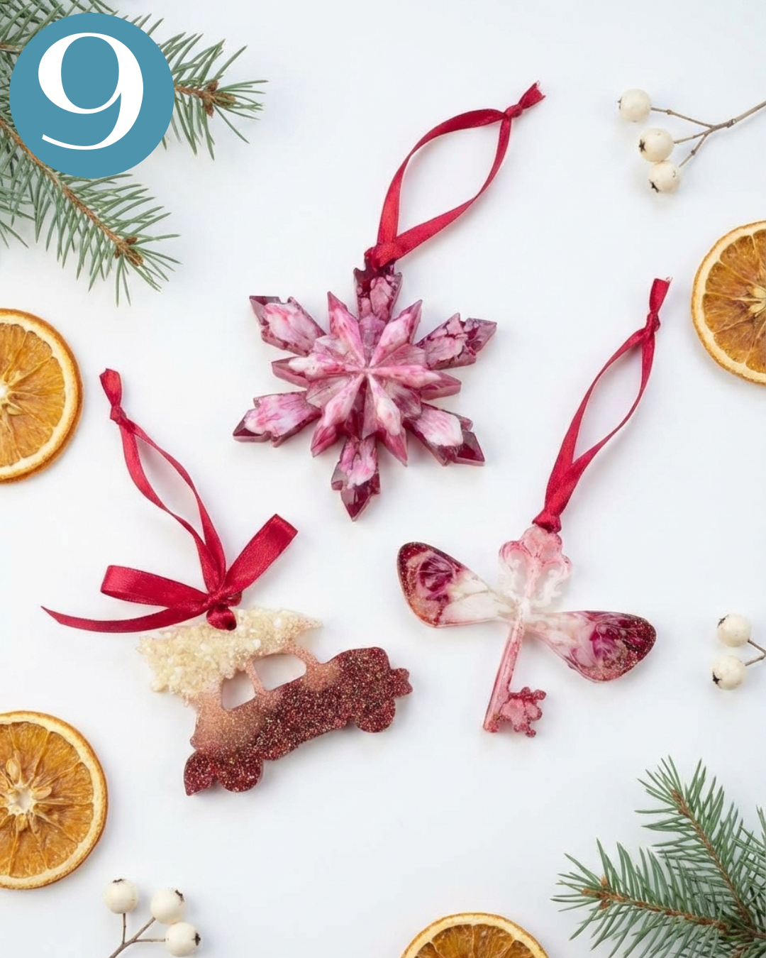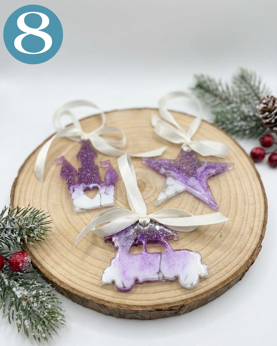 Dieses liebevoll gestaltete Set aus Weihnachtsanhängern wird vollständig von Hand aus Epoxidharz gefertigt. Jedes Element entsteht in einem sorgfältigen Prozess und ist ein kleines Kunstwerk für sich.
