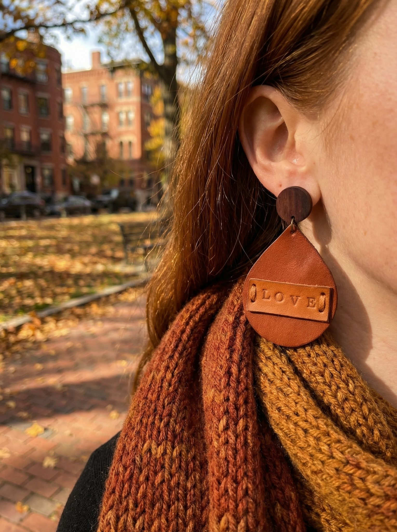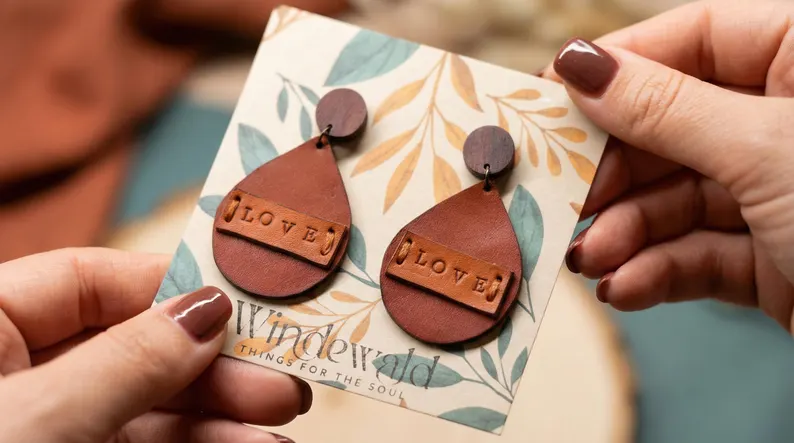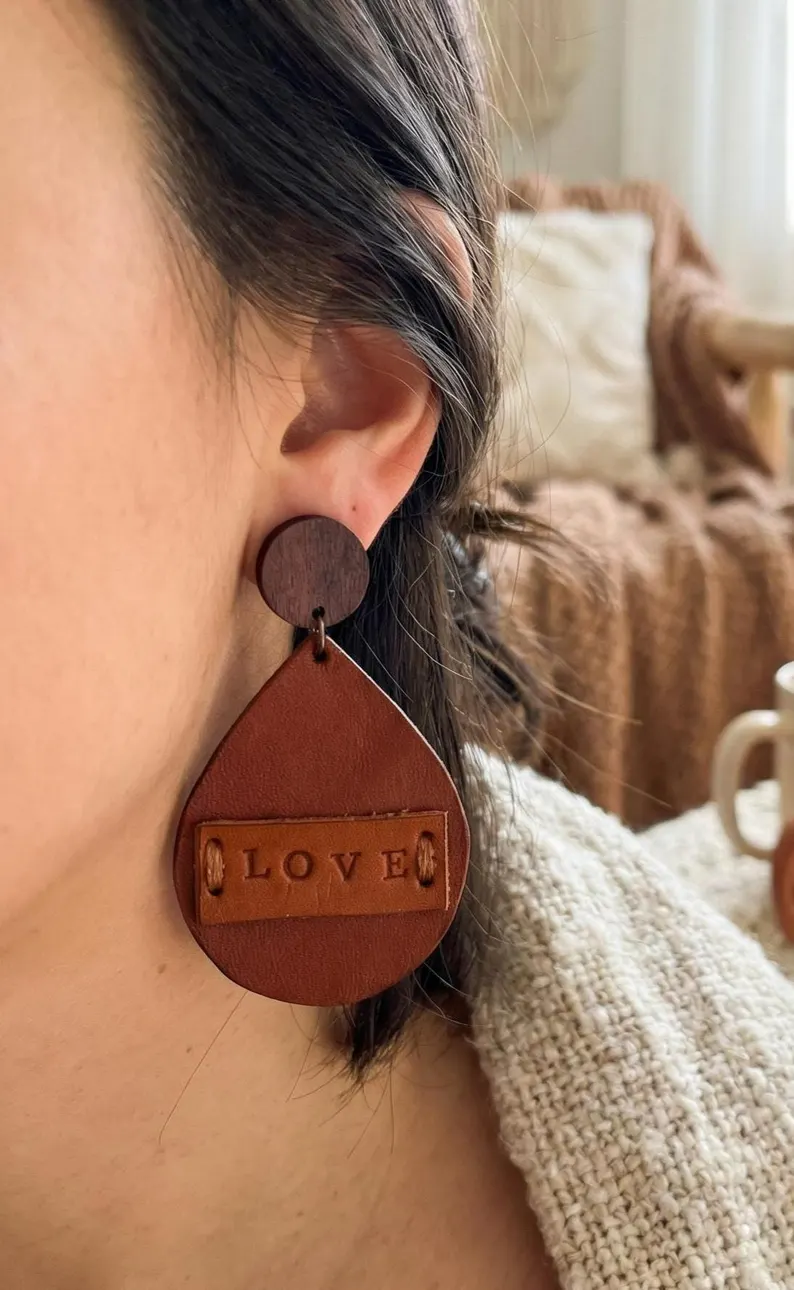 Handgefertigte Leder-Tropfenohrringe mit geprägtem „LOVE“-Detail und Holzoptik-Stecker. Eine perfekte Mischung aus minimalistischem Charme und herzlicher Botschaft für jeden Anlass.