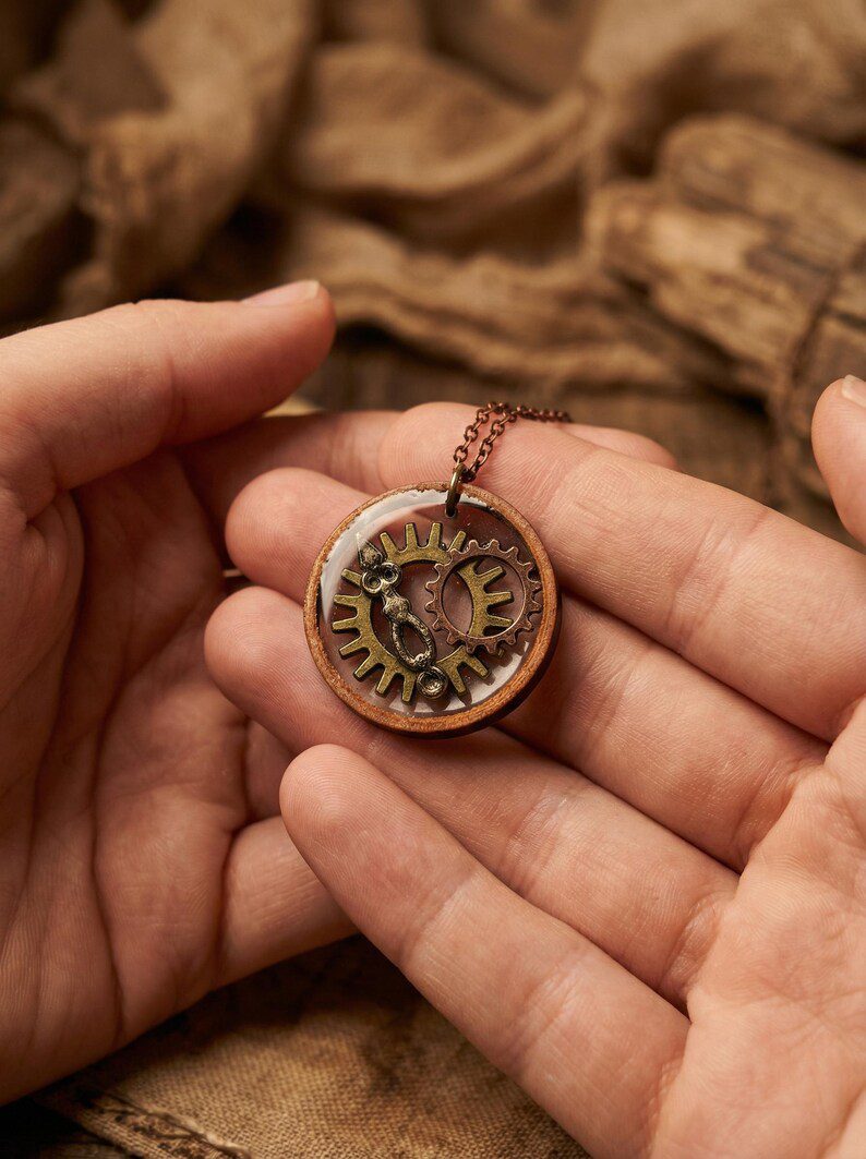 Entdecken Sie ein wirklich einzigartiges Schmuckstück mit unserer handgefertigten Steampunk Zahnrad Halskette, perfekt für alle, die kompliziertes Design und Vintage-Charme schätzen. Dieser fesselnde Anhänger zeigt eine faszinierende Anordnung von metallischen Zahnrädern und Uhrenkomponenten, sorgfältig eingefasst in einen markanten, organisch inspirierten Rahmen. Jedes Element ist sorgfältig ausgewählt, um den nostalgischen Reiz einer vergangenen mechanischen Ära hervorzurufen. An einer passenden Kette hängend, setzt diese Halskette ein kühnes Statement und verleiht jedem Outfit einen Hauch von retro-futuristischer Eleganz. Sie ist ein ideales Accessoire für Conventions, Themenveranstaltungen oder einfach, um Ihren individuellen Stil auszudrücken. Ein durchdachtes und unvergessliches Geschenk für Steampunk-Enthusiasten, Ingenieure oder jeden, der einzigartigen, handgefertigten Schmuck liebt. Umfassen Sie die Zahnräder der Zeit mit diesem außergewöhnlichen Stück.