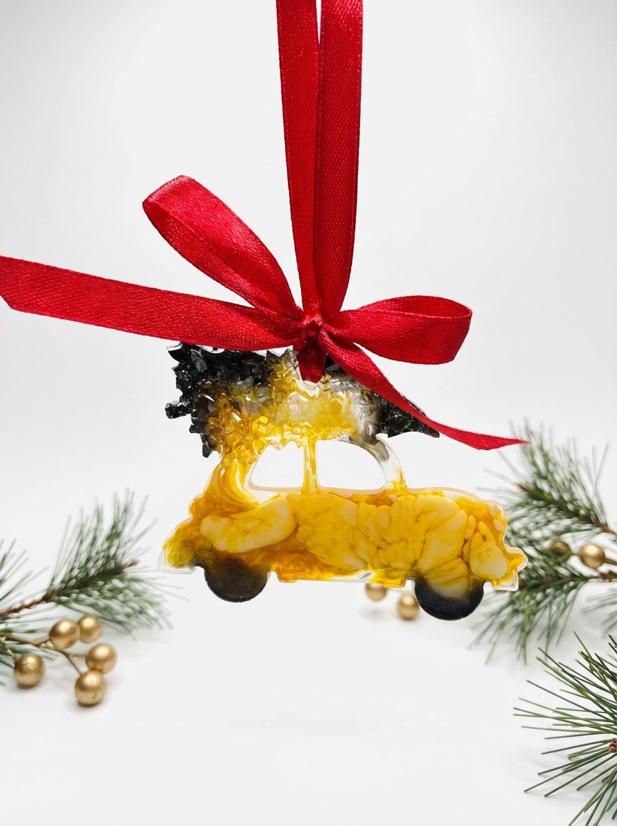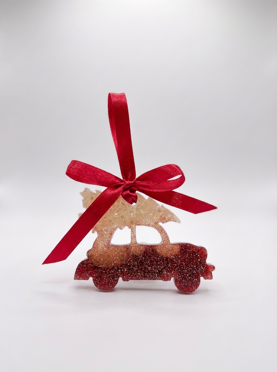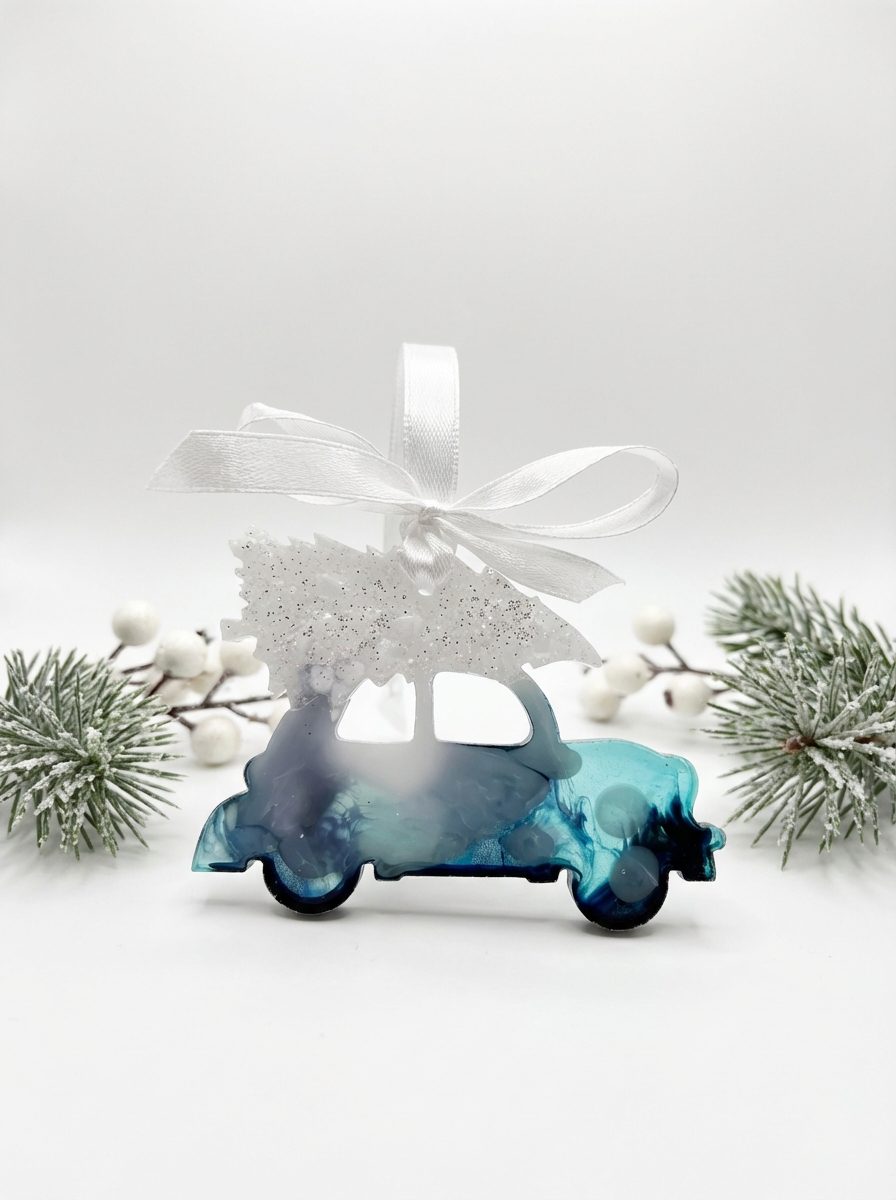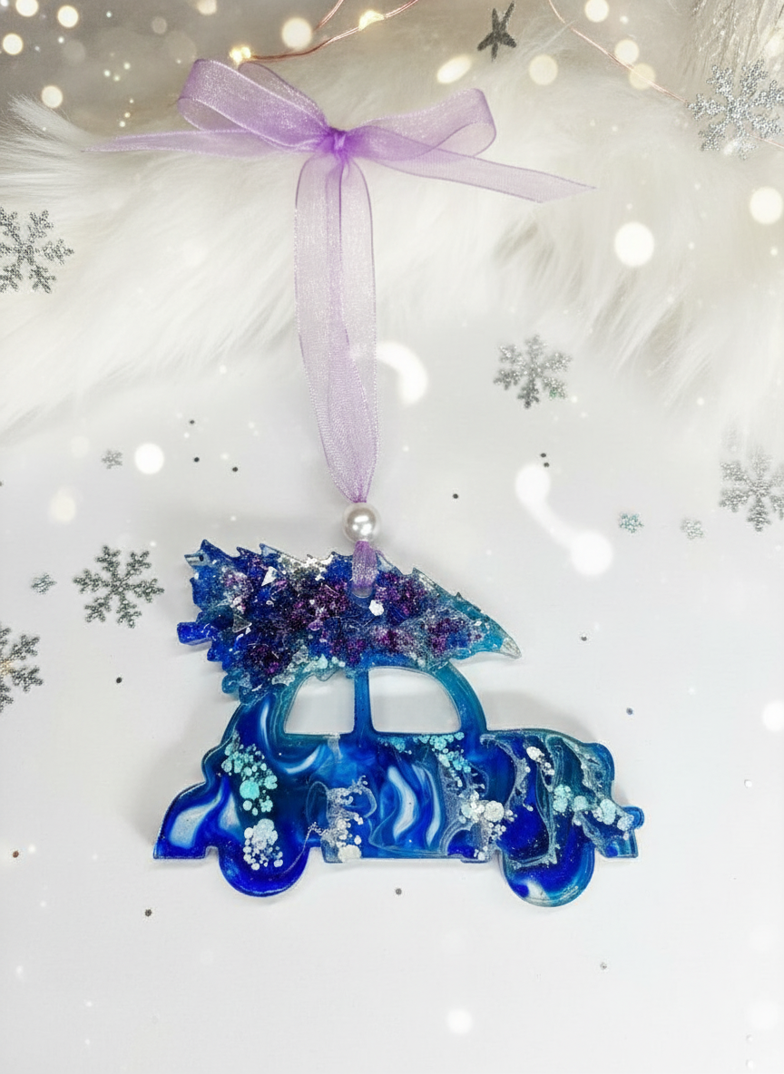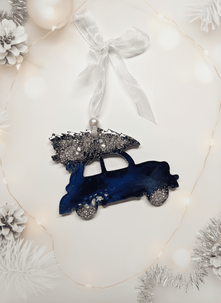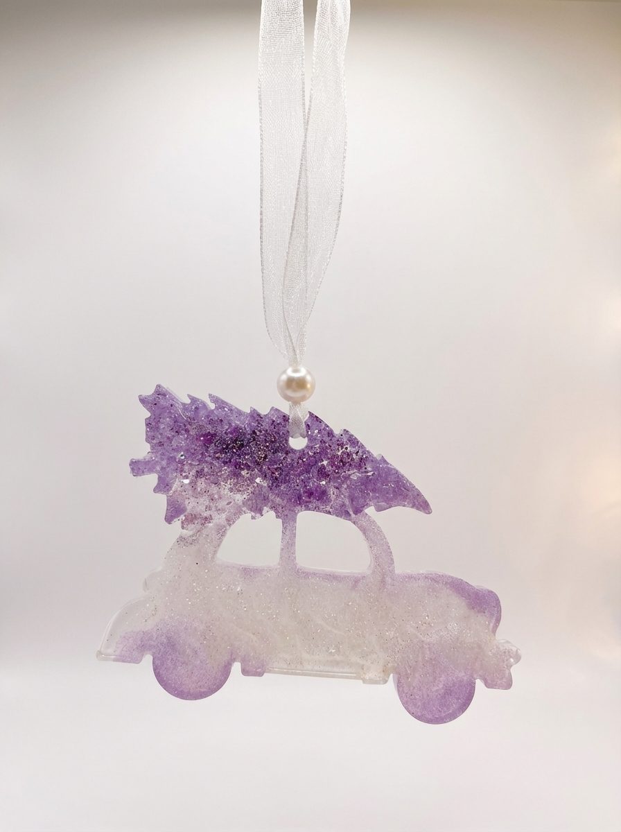 Bringe weihnachtliche Freude in dein Zuhause mit diesem liebevoll handgefertigten Anhänger „Auto mit Tannenbaum“. Die zarten Lila- und Weißtöne, kombiniert mit funkelnden Glitzerakzenten, verleihen dem Stück einen märchenhaften Winterlook. Jeder Anhänger wird sorgfältig aus hochwertigem Harz gefertigt und ist ein Unikat.