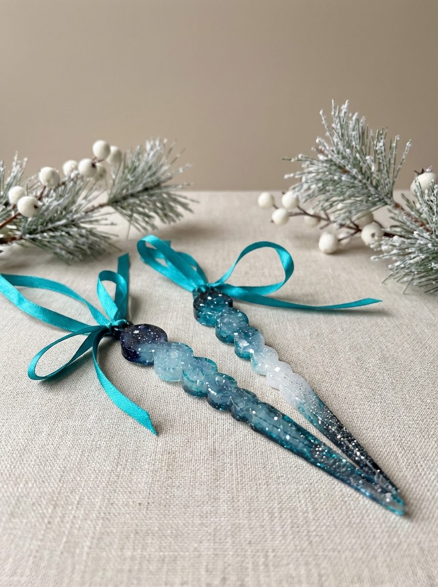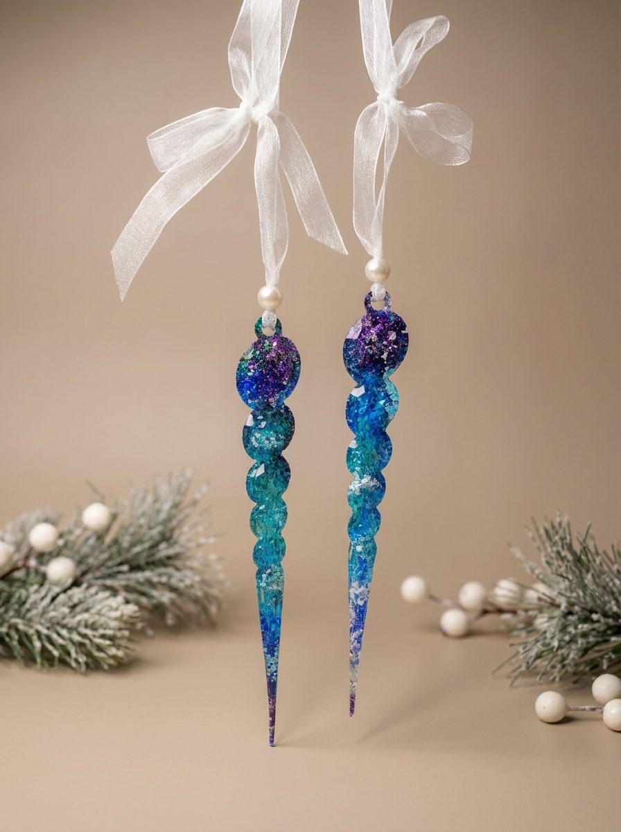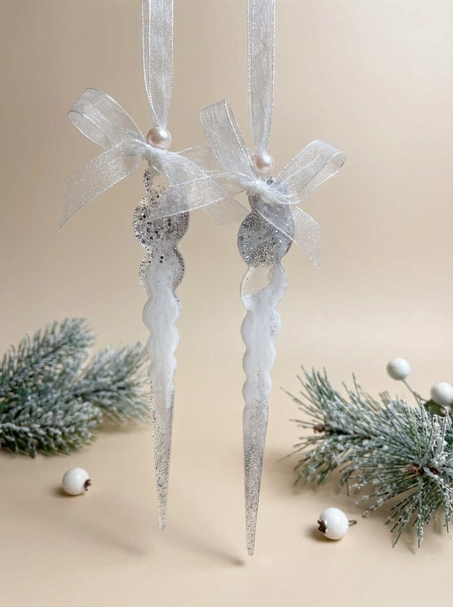 Elegante, handgefertigte Eiszapfen-Anhänger für eine winterliche und funkelnde Weihnachtsdeko. Jeder Anhänger wird einzeln gegossen und besitzt ein einzigartiges Muster. Leicht, glitzernd und perfekt geeignet für den Weihnachtsbaum, Fensterdekoration oder als liebevolle Geschenkidee.