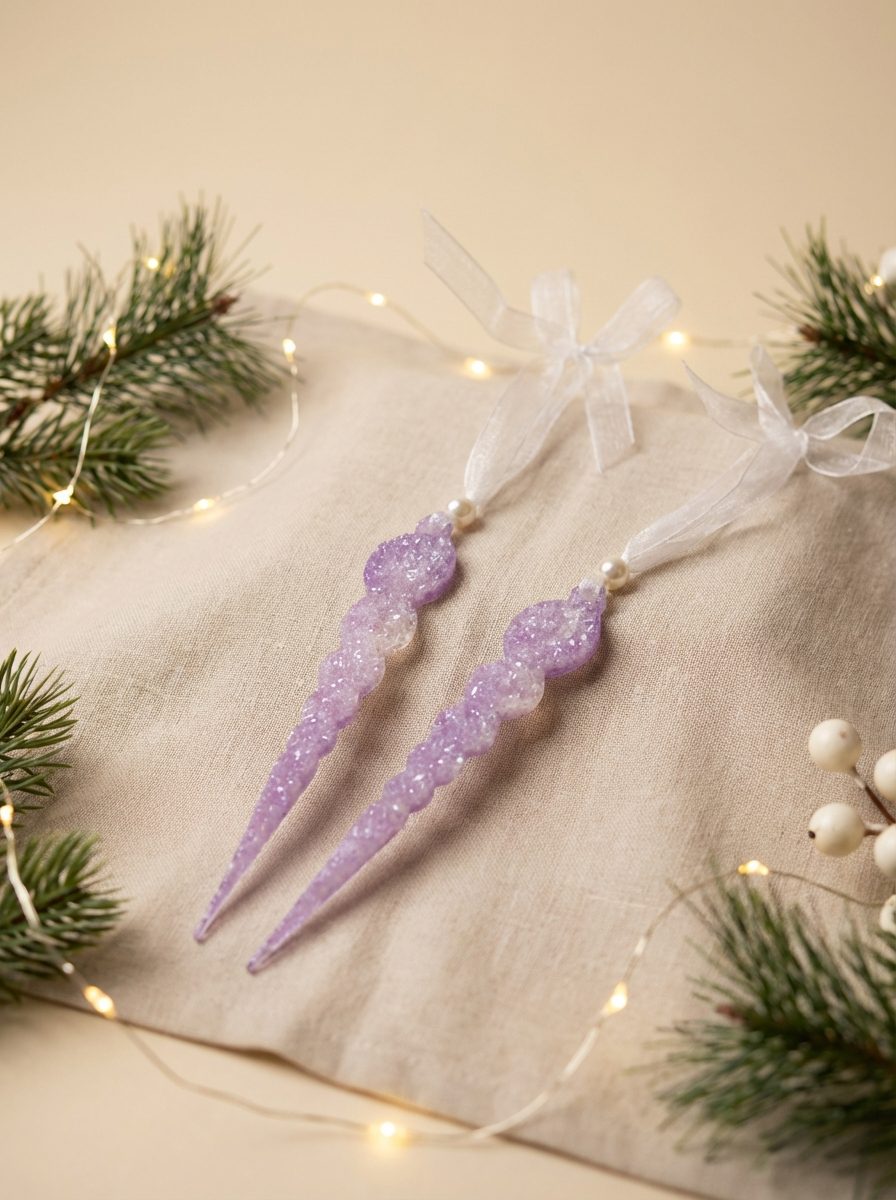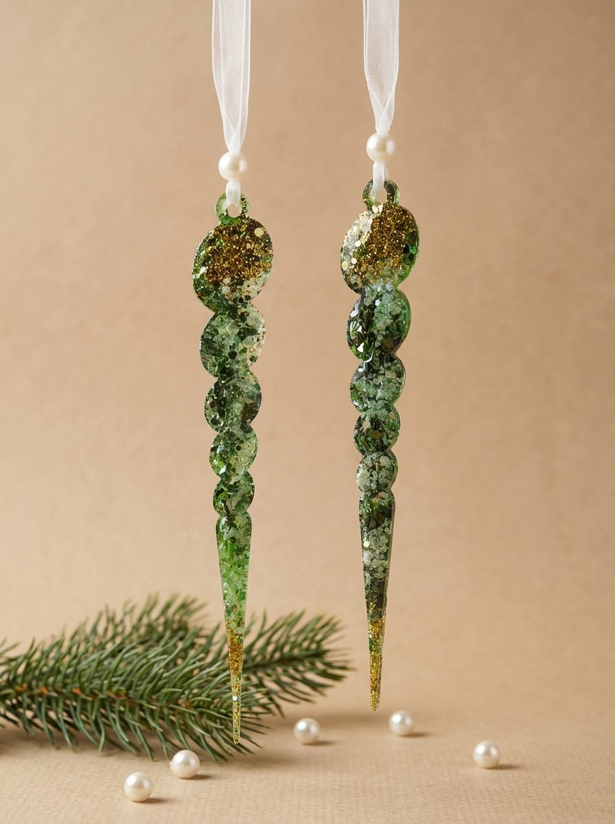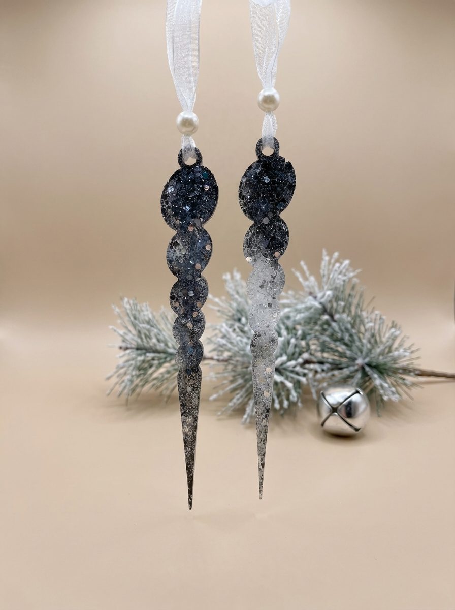 Elegante, handgefertigte Eiszapfen-Anhänger für eine winterliche und funkelnde Weihnachtsdeko. Jeder Anhänger wird einzeln gegossen und besitzt ein einzigartiges Muster. Leicht, glitzernd und perfekt geeignet für den Weihnachtsbaum, Fensterdekoration oder als liebevolle Geschenkidee.